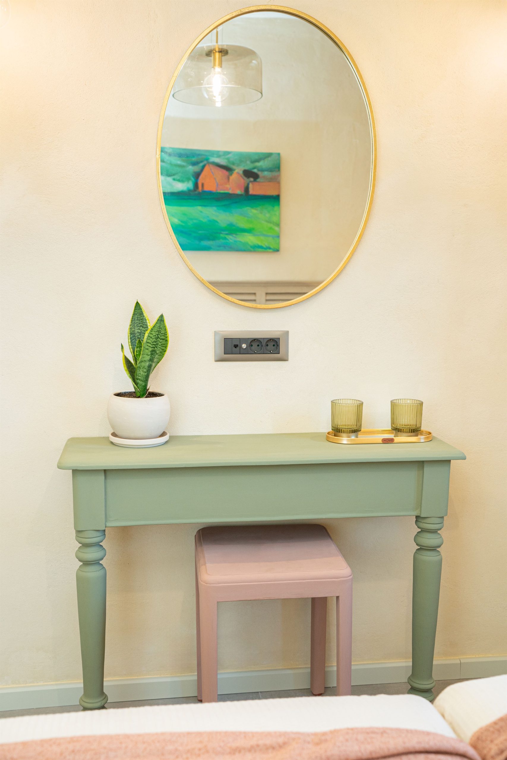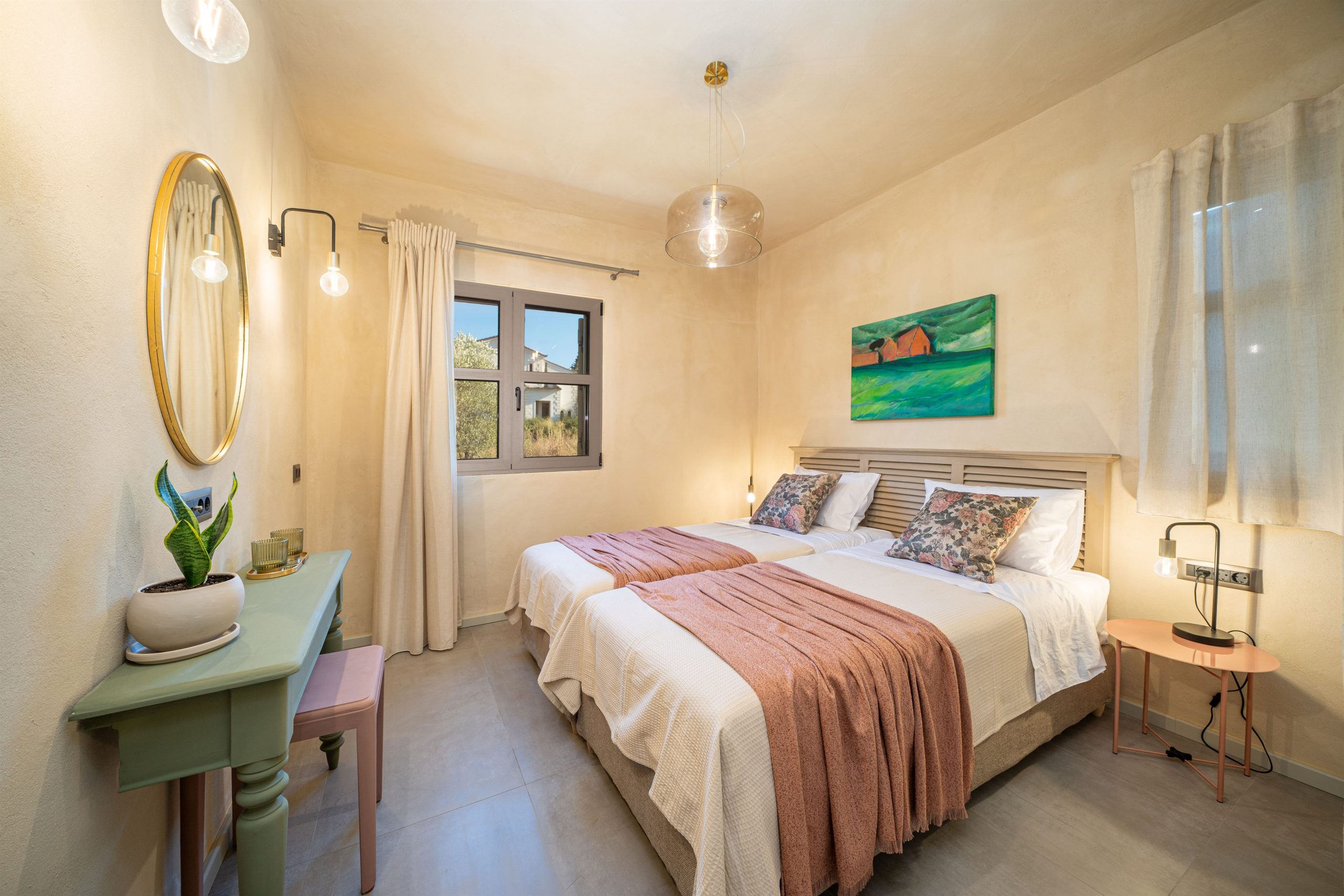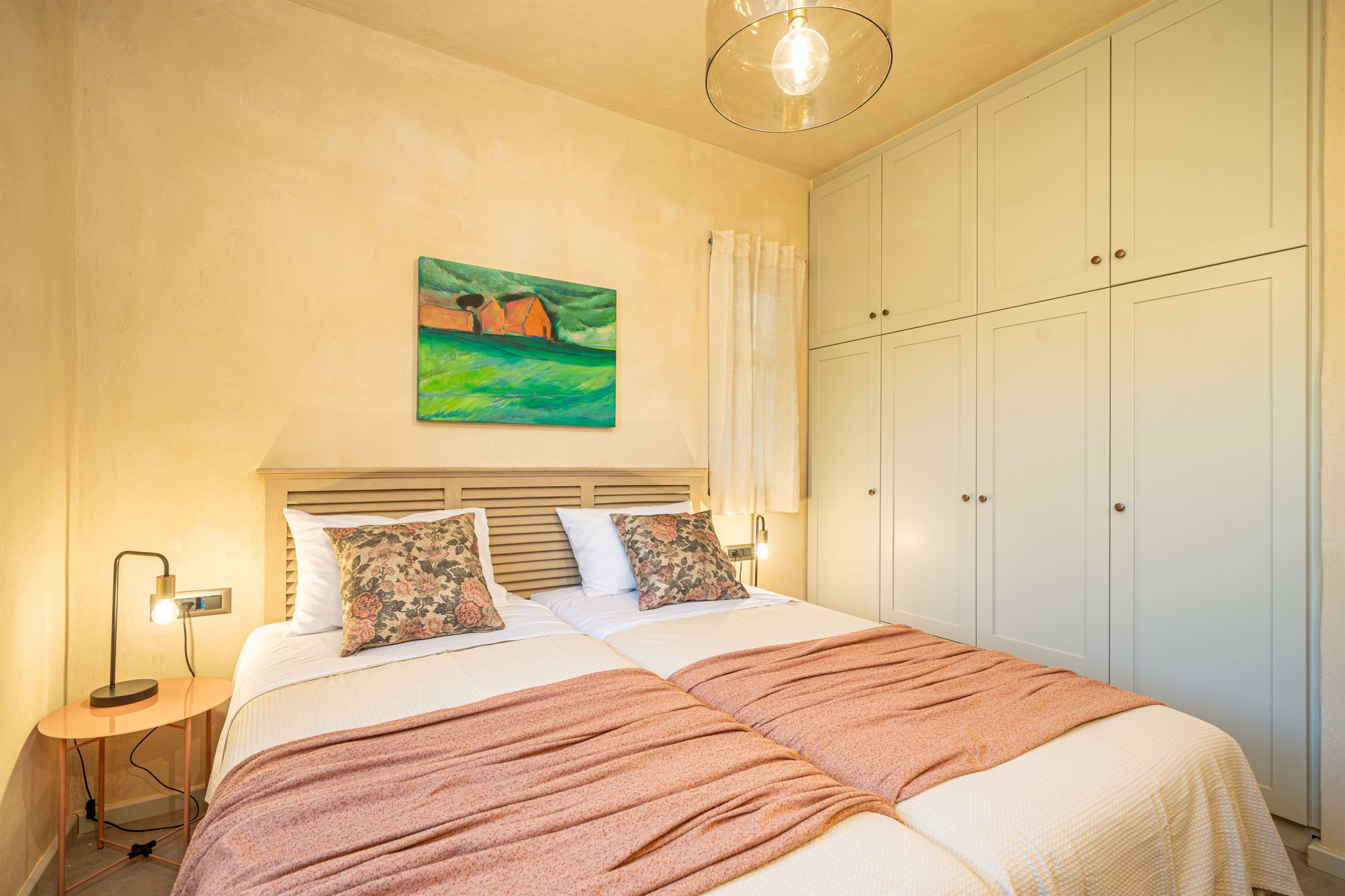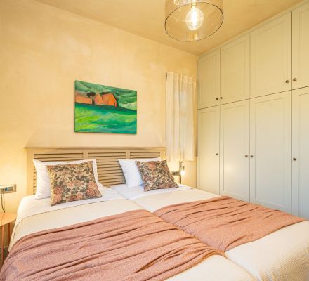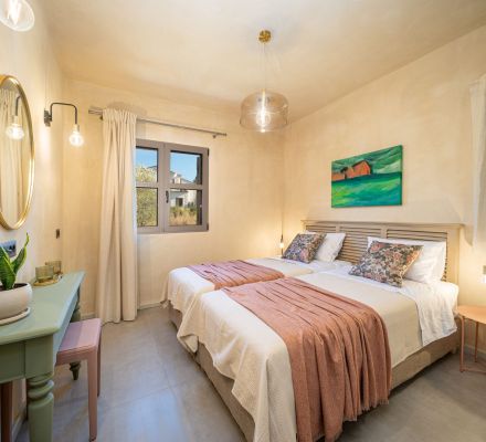 Ένα ευέλικτο υπνοδωμάτιο με δύο μονά κρεβάτια (μπορούν να ενωθούν σε διπλό αν χρειαστεί), ιδανικό για παιδιά, φίλους ή δεύτερο ζευγάρι. Ήρεμο και άνετο, με εντοιχισμένους αποθηκευτικούς χώρους και θέα προς τον κήπο.