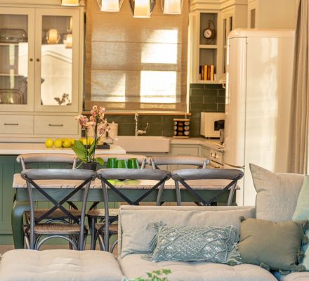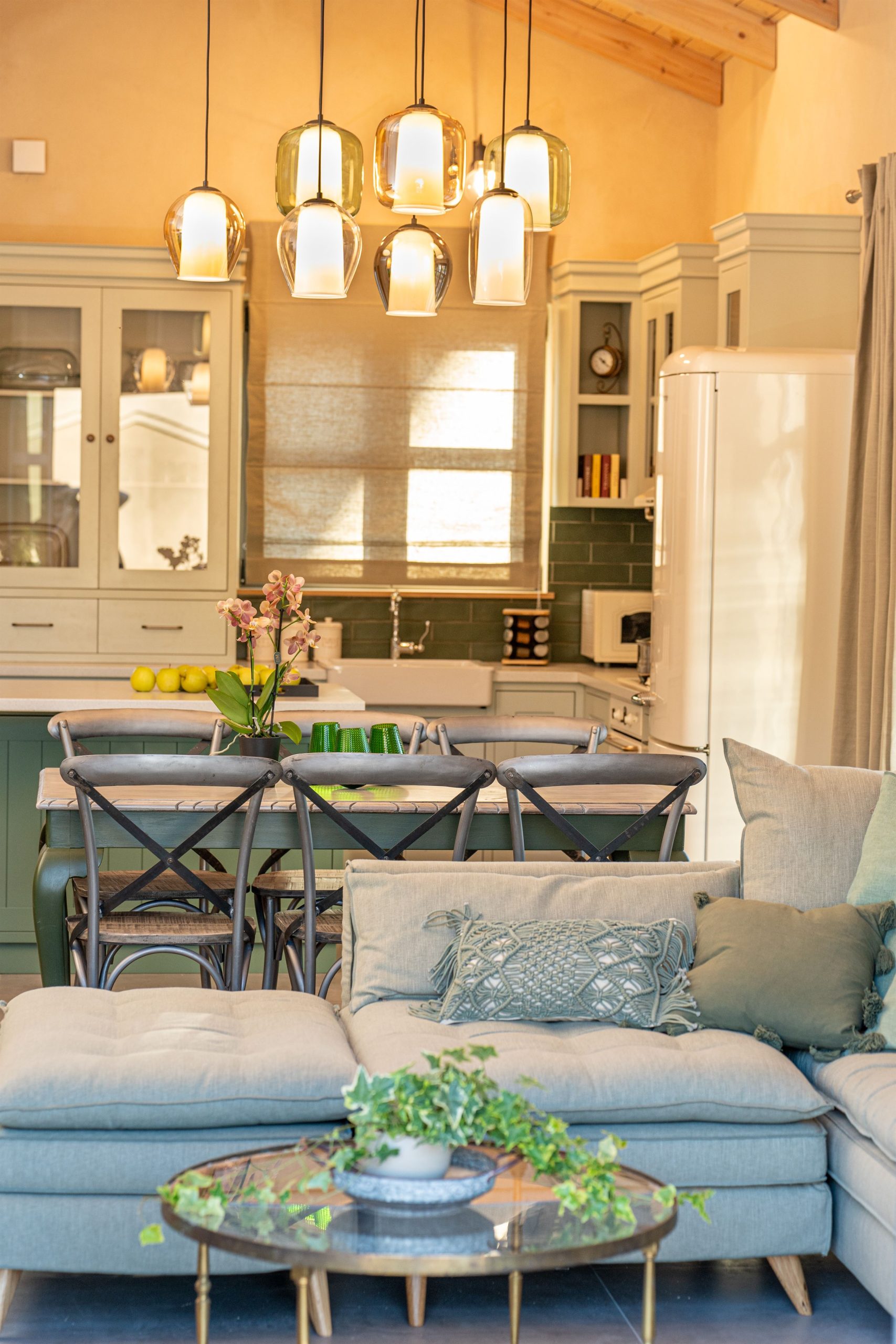 Ενιαίος, ανοιχτός χώρος με άνετο καναπέ και τραπέζι φαγητού, συνδεδεμένος με πλήρως εξοπλισμένη κουζίνα που διαθέτει ό,τι χρειάζεστε για την αυτόνομη προετοιμασία γευμάτων.