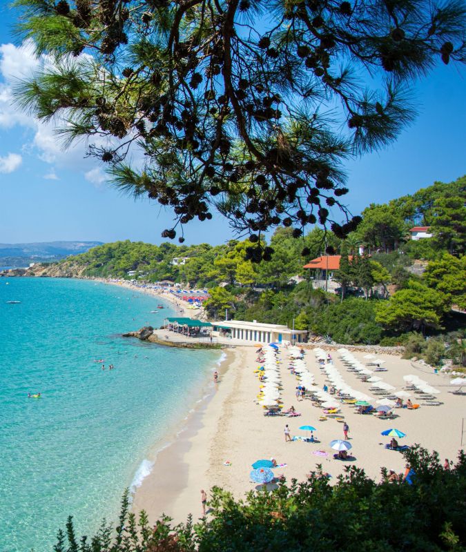 Μια αληθινή απόδραση: απομονωμένος τιρκουάζ κολπίσκος, πλαισιωμένος από βράχια και πεύκα, με κρυστάλλινα νερά και λευκά βότσαλα.