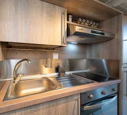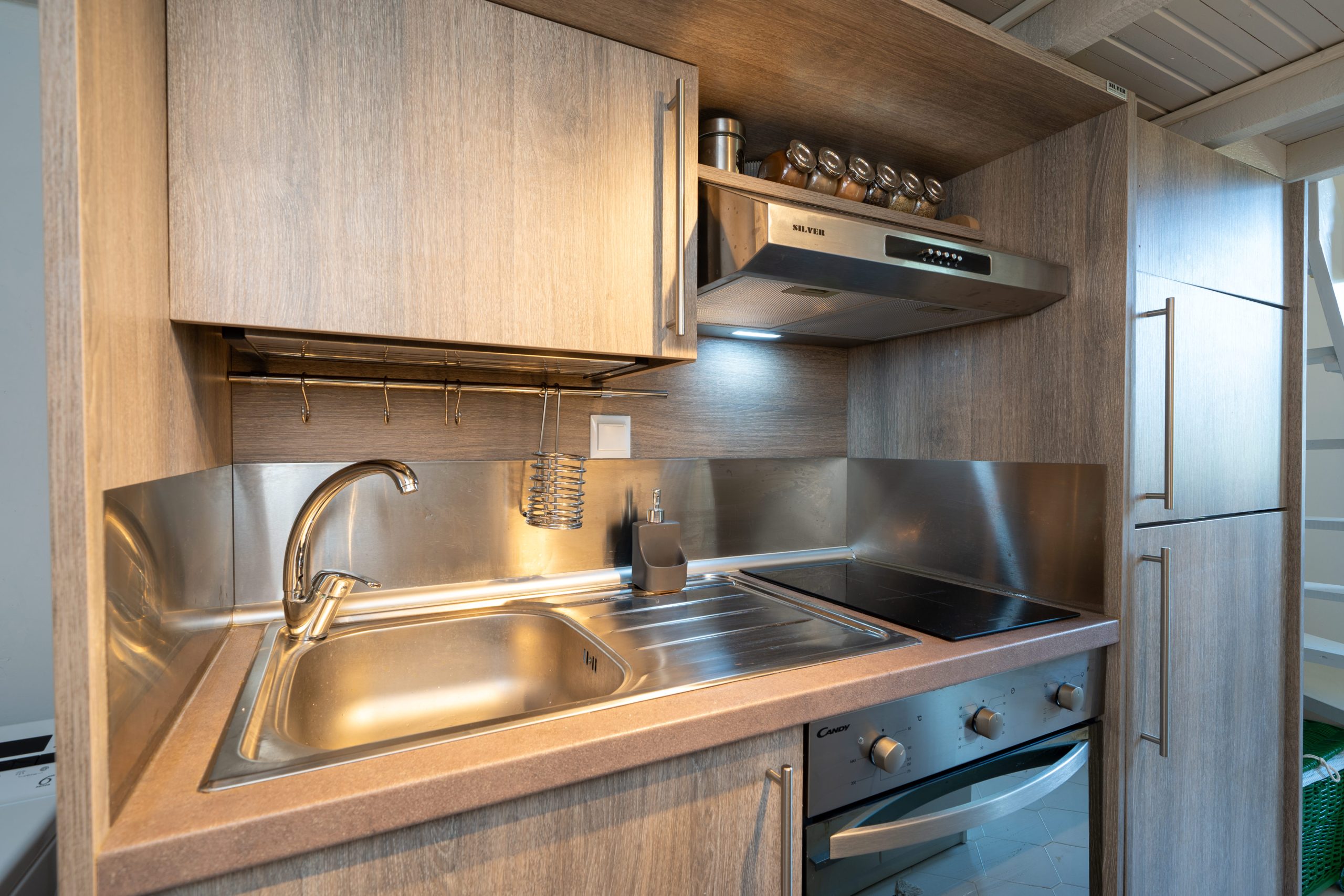 Κουζινάκι / πλήρως εξοπλισμένη κουζίνα: φούρνος ή εστίες, φούρνος μικροκυμάτων, ψυγείο, σκεύη & εργαλεία κουζίνας