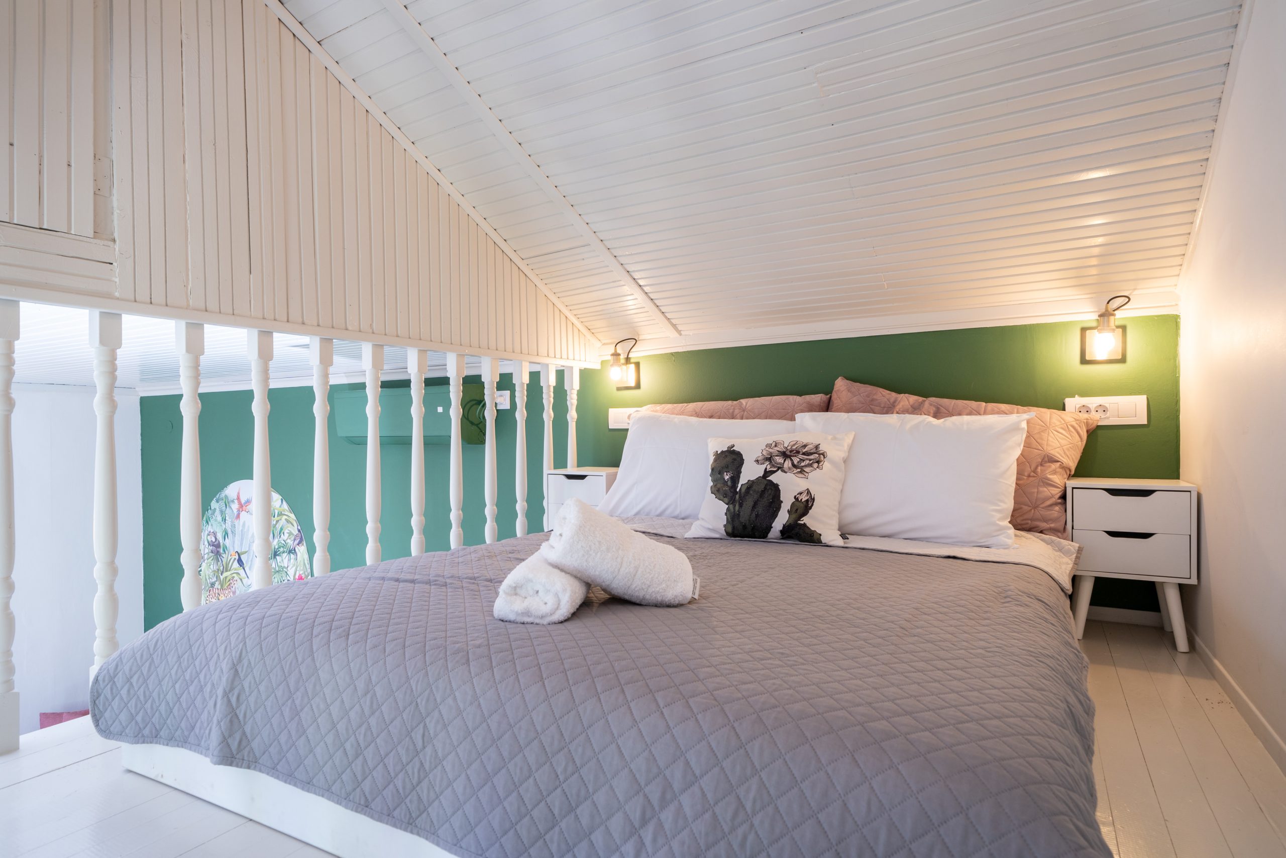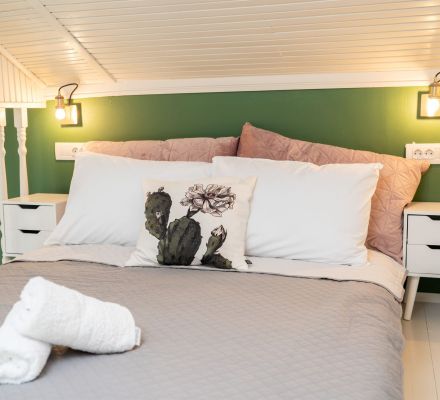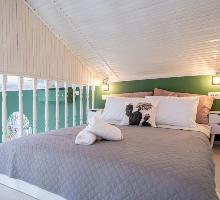 Βρίσκεται σε υπερυψωμένο επίπεδο και προσφέρει ιδιωτικότητα και ζεστασιά, με άνετο διπλό κρεβάτι, φυσικό φως και ήρεμη ατμόσφαιρα — ιδανικό για ξεκούραστες νύχτες.