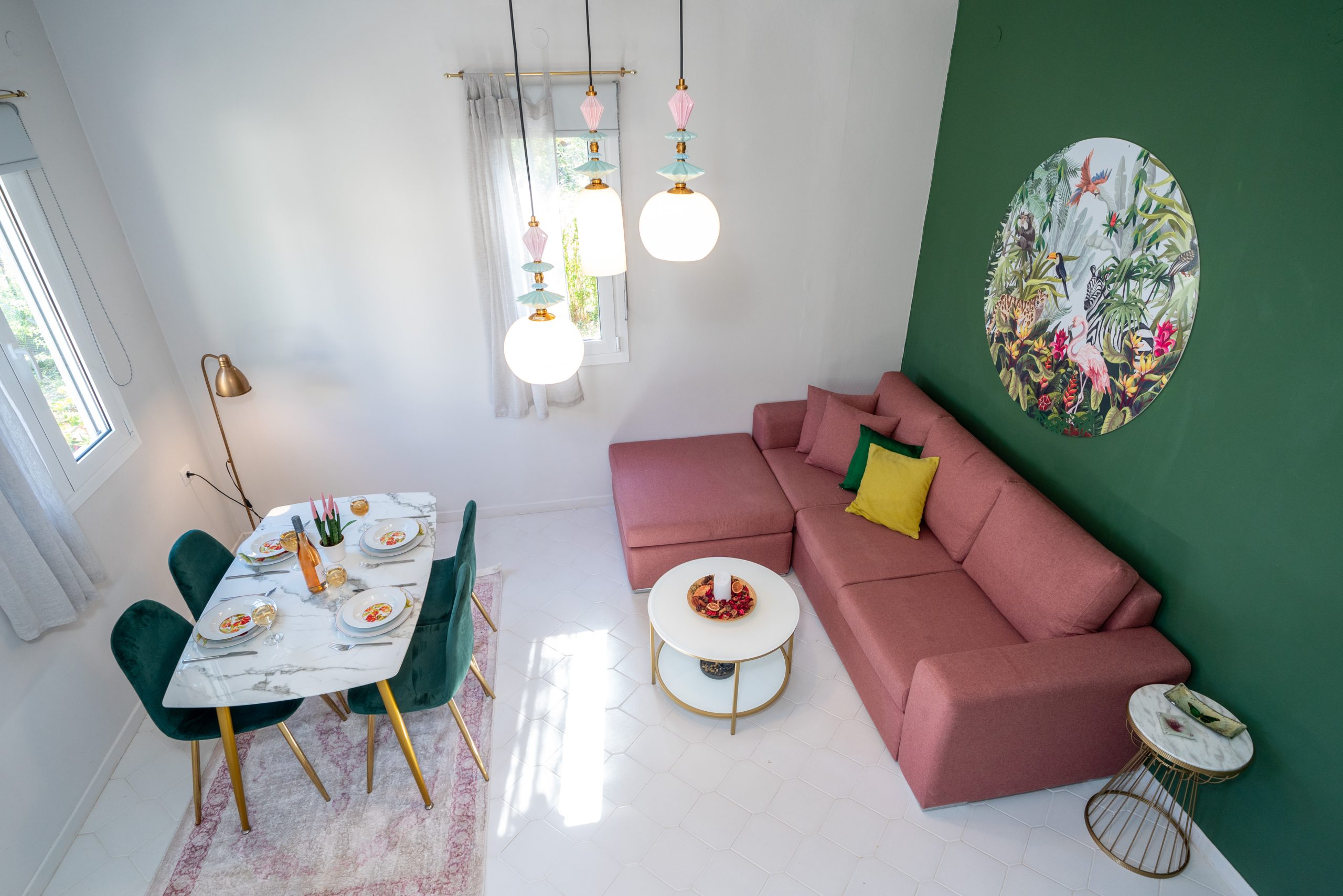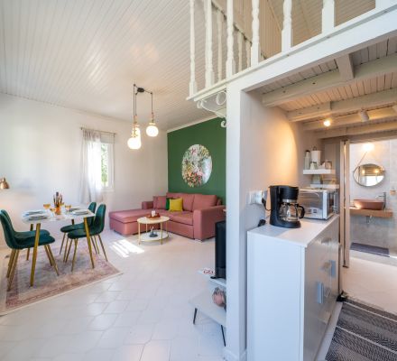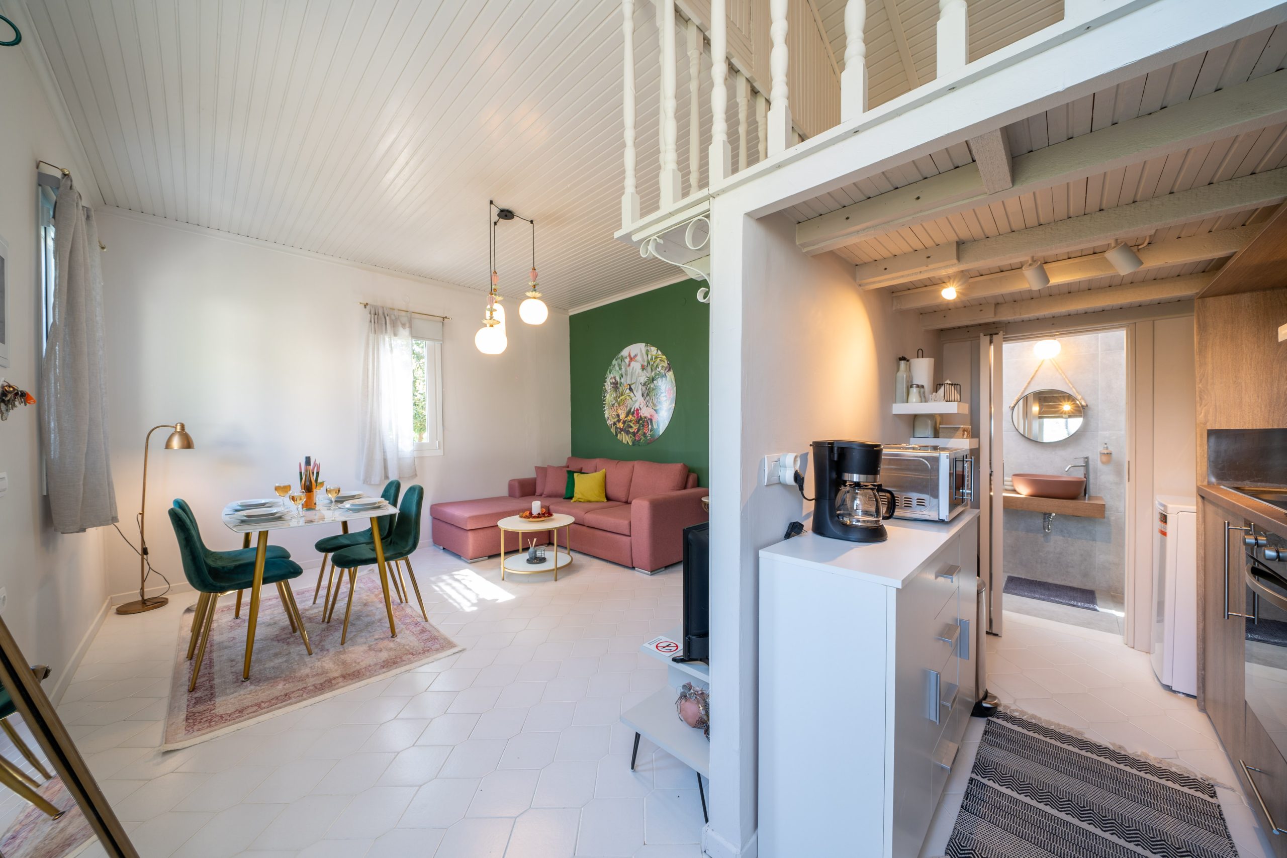 Ενιαίος χώρος που συνδυάζει άνετο καθιστικό με πλήρως εξοπλισμένη κουζίνα και μικρό τραπέζι φαγητού. Απλός, λειτουργικός και ιδανικός για χαλάρωση ή μαγείρεμα στο σπίτι.
